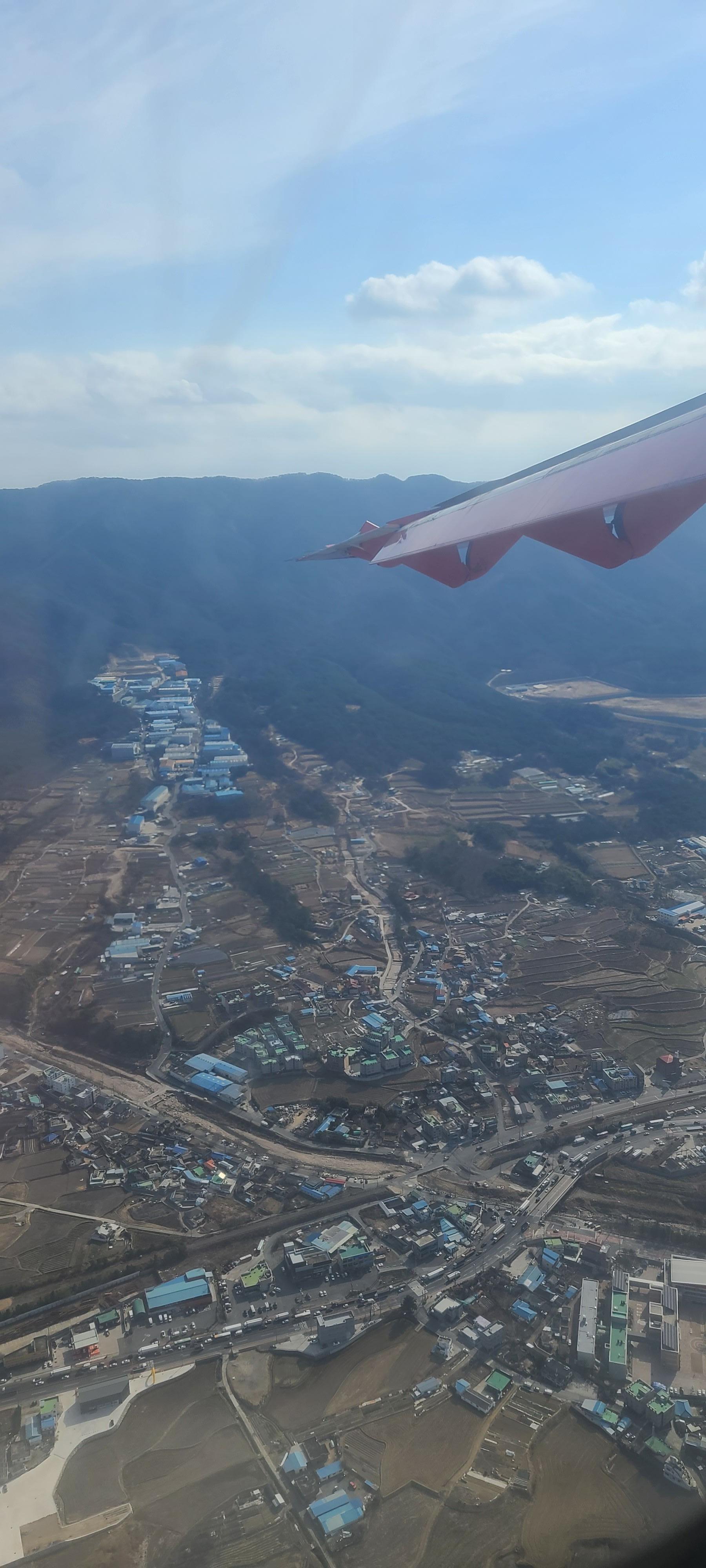 창밖엔 익숙한 도시 풍경과 멀리 비행기의 꼬리 날개가 살짝 보인다.