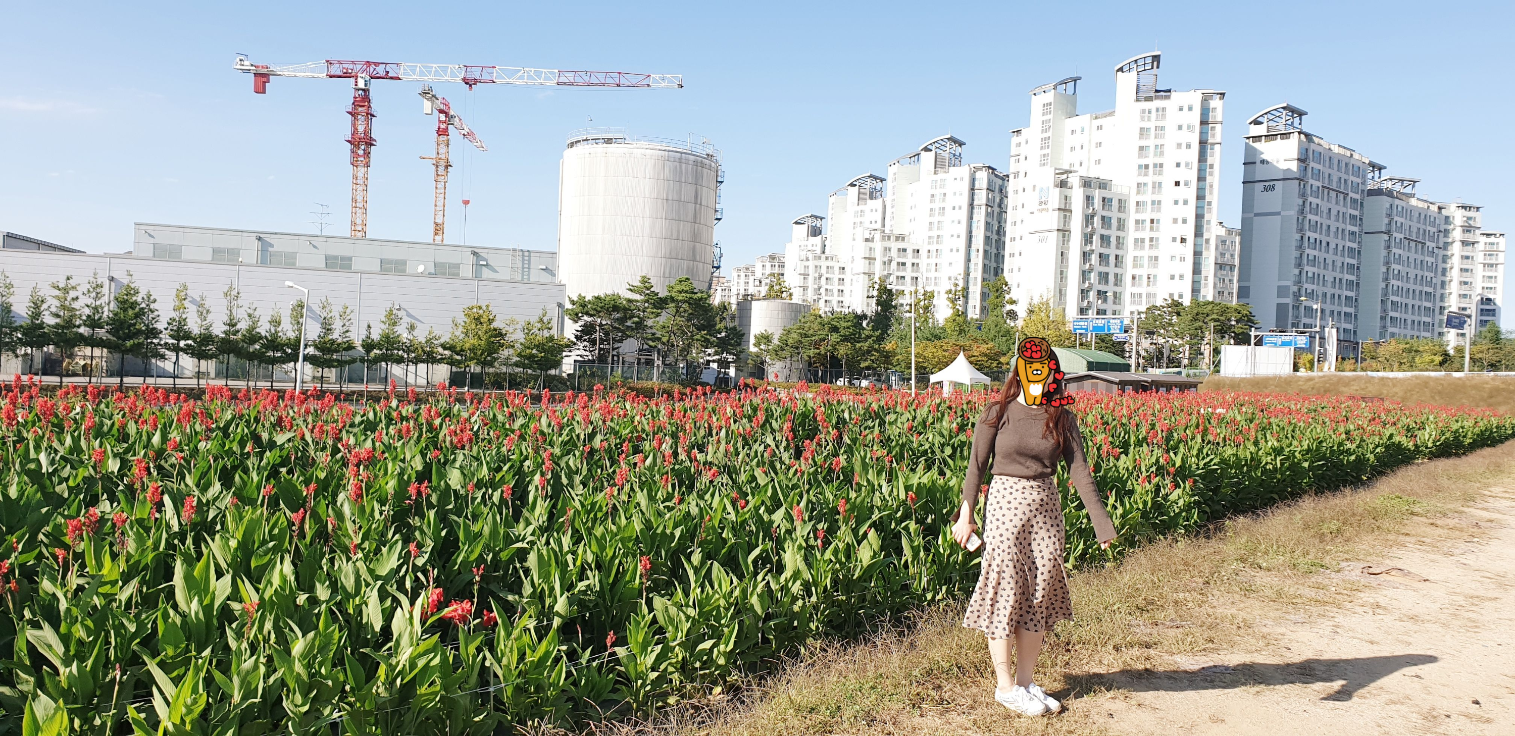 아파트와 공사 크레인, 그 앞에 선 네 모습.